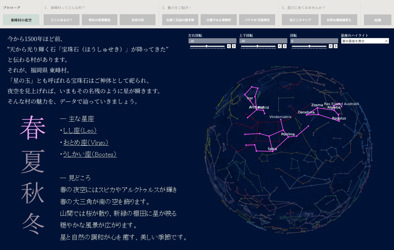 東峰村独自の地域通貨データ、観光入込データ、人流データ、観光HPアクセスログデータなどを活用し、東峰村の特徴や魅力をグラフィカルに、そして一部はインタラクティブな形でご覧いただけるようになっています。